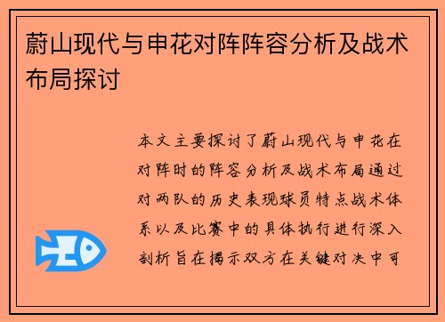 本文主要探讨了蔚山现代与申花在对阵时的阵容分析及战术布局。通过对两队的历史表现、球员特点、战术体系以及比赛中的具体执行进行深入剖析,旨在揭示双方在关键对决中可能采取的策略和应对方式。在本场较量中,蔚山现代凭借其强大的进攻能力和组织能力,以及申花在防守反击中的灵活性,将成为比赛的焦点。此外,文章还将讨...