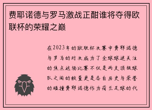 费耶诺德与罗马激战正酣谁将夺得欧联杯的荣耀之巅